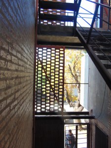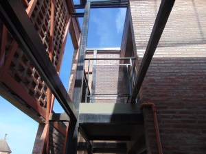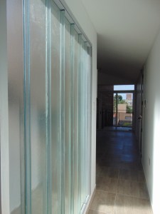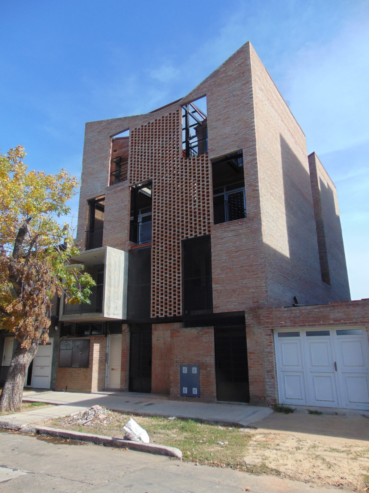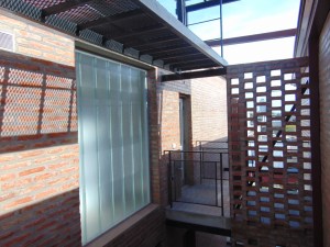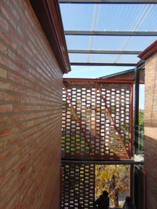 Este recorrido, las transiciones inducidas, las expansiones en altura de cada vivienda, quedan envueltas y filtradas por la pantalla de mampostería calada con que se presenta el conjunto a la calle, al barrio, que de esta forma va “admitiendo” su densificación no traumática: la vereda oeste de Necochea al 4000 puede empezar a leerse en parte de su desarrollo como tal, un “nuevo vecindario“ … a escala barrial, el germen, quizás, de una nueva ciudad, más densa, equilibrada, amigable.